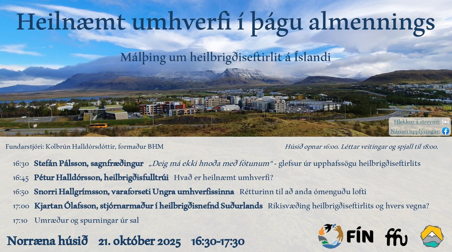 Málþing um heilbrigðiseftirlit á Íslandi verður haldið í Norræna húsinu þann 21. október 2025 kl. 16:30–17:30. Viðburðurinn ber yfirskriftina „Heilnæmt umhverfi í þágu almennings“ og er skipulagður af Félagi heilbrigðis- og umhverfisfulltrúa í samstarfi við FÍN.